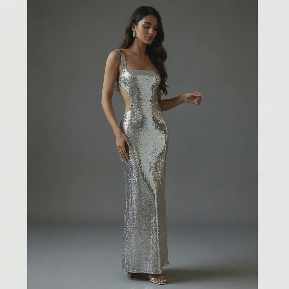 Sparkling Glitter Sequin Gown - Open-Back...